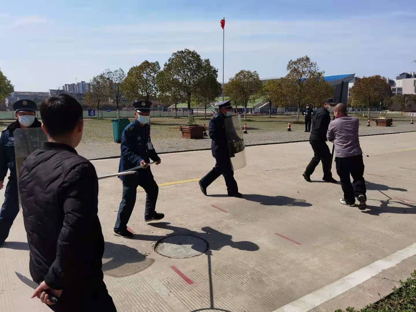 演练现场,两名 “暴徒” 欲强闯校园,持械砍人,危机之下,门卫保安立即上前阻拦,并大声呵斥“有暴恐分子”!岗亭值班人员立即拨打110报警,同时警示师生疏散。特警等各方警力火速赶到现场,举枪呵斥,将顽抗的“暴徒”制服,压上警车。