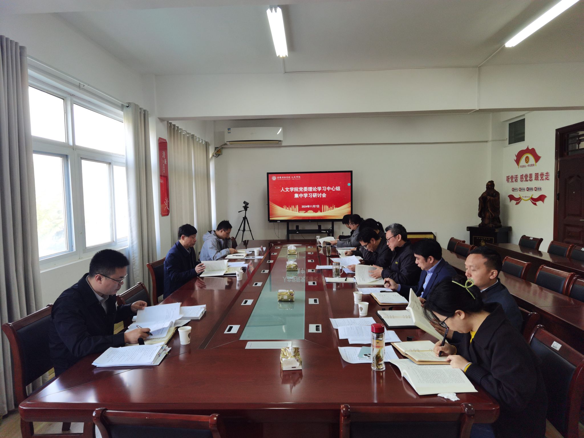 11月7日上午,根据学校党委《二级党组织理论学习中心组学习列席旁听工作实施方案》和党委宣传部相关通知精神,校党委书记时伟莅临指导人文学院党委理论学习中心组集中学习研讨会。本次学习研讨会主题为“贯彻习近平文化思想,助力文化强国建设”,由人文学院党委副书记、院长李晓东主持。党委宣传(统战)部副部长胡文靖、宣传教育科科长于宏亮列席旁听。
