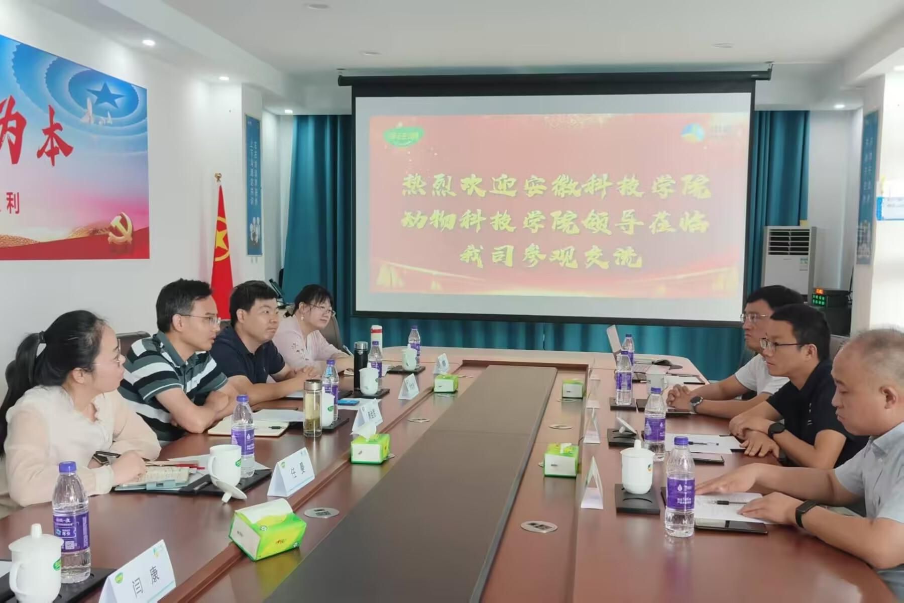 公司负责人俞俊总经理详细介绍了企业的发展历程、产业布局、技术创新成果以及人才需求方向,重点展示了其在现代化养殖、食品安全开发等方面的先进经验。周金星介绍了动物科学学院的学科建设、专业特色、人才培养模式以及科研团队在动物养殖、疫病防控等领域的研究。他表示,学院坚持培养适应行业发展需求的高素质应用型人才,希望通过此次访企拓岗,与中粮家佳康搭建起深度合作的桥梁,在实习实训基地建设、产学研项目合作、毕业生就业等方面实现优势互补、共赢发展。双方围绕产教融合、协同育人、科研项目联合攻关等具体事宜进行了深入探讨,并达成初步合作意向。