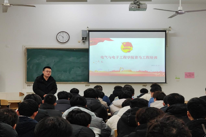 为深入学习贯彻习近平新时代中国特色社会主义思想,提高学生干部思想政治素养,坚定理想信念,厚植爱国主义情怀彰显青春风采。电气与电子工程学院于2023年12月27日在致知楼C105举办青马工程培训会学院全体学生干部参加会议。会议由于宏亮老师主持。