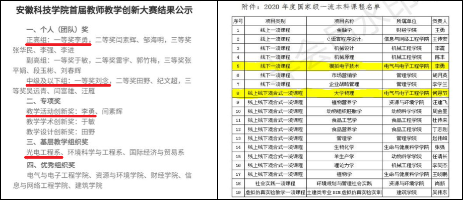 一直以来,光电工程系教工党支部注重加强支部建设,经过支部党员和教师的共同努力,在一流专业建设、一流课程申报、教师教学创新大赛、科研成果、教书育人等方面取得显著成效。光电工程系教工样板支部建设成果颇丰,光电信息科学与工程专业成功获批为省级一流建设专业,《模拟电子技术》与《大学物理》课程被推荐为国家一流建设课程,刘念获得学校首届教师课程思政教学大赛一等奖,李勇、刘念分别获得首届爱体育平台高校教师教学创新大赛正高组一等奖、讲师组一等奖,刘念获得首届安徽省高校教师教学创新大赛现场赛入围资格,党支部基本上每位党员教师均有在研高质量科研教研项目,左绪忠获批的国家自然科学基金项目现已结题验收,实现了电气与电子工程学院国家自然科学基金零的突破,教师发表高质量SCI学术论文一区2篇、二区4篇、三区3篇、四区2篇,教师指导学生参加国家级大学生物理实验大赛获奖4项,学生考研率逐年递增,学生学风建设取得成效等。