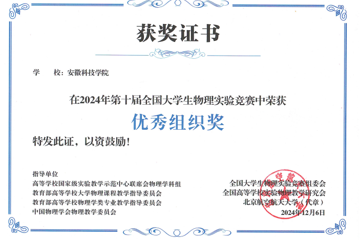 11月25日,国家级实验教学示范中心联席会物理学科组、教育部大学物理课程教学指导委员会、全国高等学校实验物理教学研究会、中国物理学会物理教学委员会和全国大学生物理实验竞赛组委会联合主办的第十届全国大学生物理实验竞赛(创新)圆满落幕。比赛吸引了来自包括北京大学、清华大学、中国科学技术大学、浙江大学等全国31个省667所高校的2755只队伍,共计15715名师生参赛。我校选派的5支参赛队伍在此次竞赛中表现突出,获得国家二等奖1项、三等奖2项、优秀奖2项的优异成绩,学校获得优秀组织奖。