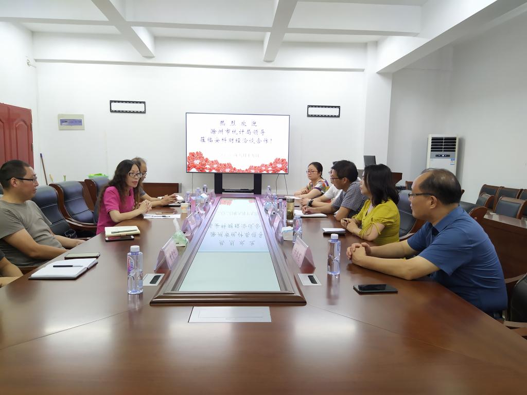 8月19日,滁州市统计局城市调查队队长周奋兵一行来我校财经学院洽谈合作,学院副院长郝世绵、金怀玉,国际经济与贸易系主任李强博士,经管综合实验中心主任李宝礼博士等出席洽谈会。