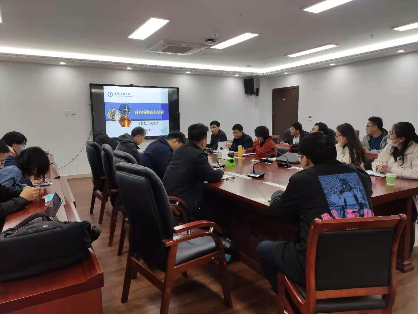 2020年11月6日下午财务处在龙湖校区西辅楼4楼会议室举办龙湖校区第二批财务报销业务专题培训会。龙湖校区管理学院、化材学院等学院部分教师和财务处有关人员参加培训会。培训会由财务处汤文成主讲。