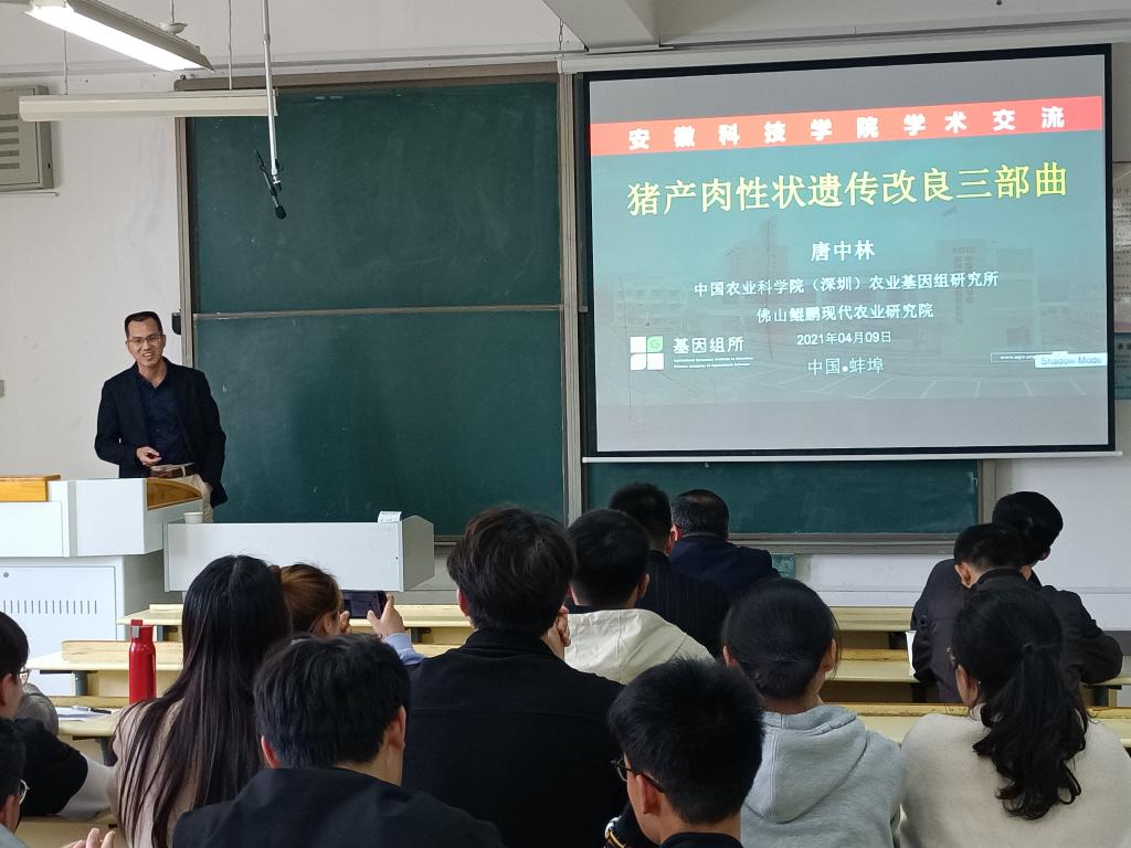 4月9日下午,《爱体育平台学报》期刊发展研讨会系列学术报告在凤阳校区新知楼A403举行。中国农业科学院“猪基因组设计育种创新团队”首席科学家、中国农业科学院(深圳)农业基因组研究所动物基因组研究中心主任、博士生导师唐中林应邀来校作学术报告。报告由动物科学学院副院长华金玲主持,学院部分教师、养殖领域硕士研究生及动物科学、动植物检验检疫等专业本科生聆听报告。