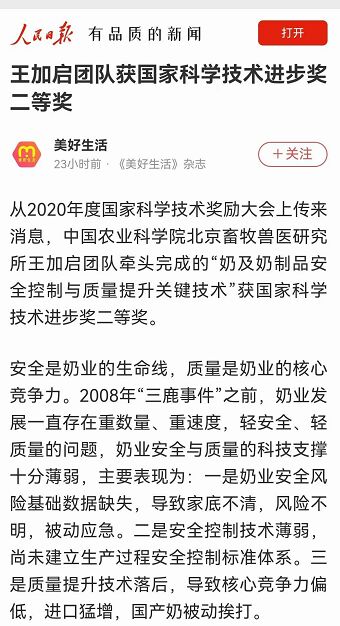 王加启研究员团队,自2005年起,主持全国复原乳、生鲜乳、风险评估及国家牛奶品质973等项目,82家科研单位共同参与,历时15年,实现内地31个省全覆盖,积累有效数据232万条,成功构建奶产品风险因子与品质因子评价数据库,解决了家底不清的重大难题,运用大数据分析与多标准排序模型,准确锁定2008年至2016年我国奶及奶制品中前4类主要风险因子分别是违法添加物、霉菌毒素、兽药残留和重金属污染。研究制定牛奶中4类违法添加物检测标准,农业农村部直接采用,实现全国4241个奶站和5280辆奶车全覆盖,为打击非法添加行为发挥了决定性技术支撑作用。研发出14种霉菌毒素、61种兽药和22种重金属及元素3个系列同步检测技术,被农业农村部列为指定方法,解决了奶产品风险因子检测效率低和成本高的技术难题。培训一线检测技术骨干人员5000余人次,使具备生鲜乳检测资质的省级质检机构增加到43个,实现除港澳台外31个省份全覆盖,显著推动整个行业检测技术进步。制定21项安全控制标准,推广应用后,生乳中黄曲霉毒素M1、兽药残留、重金属污染、菌落总数和体细胞数等主要风险因子显著降低,达到欧美发达国家标准。