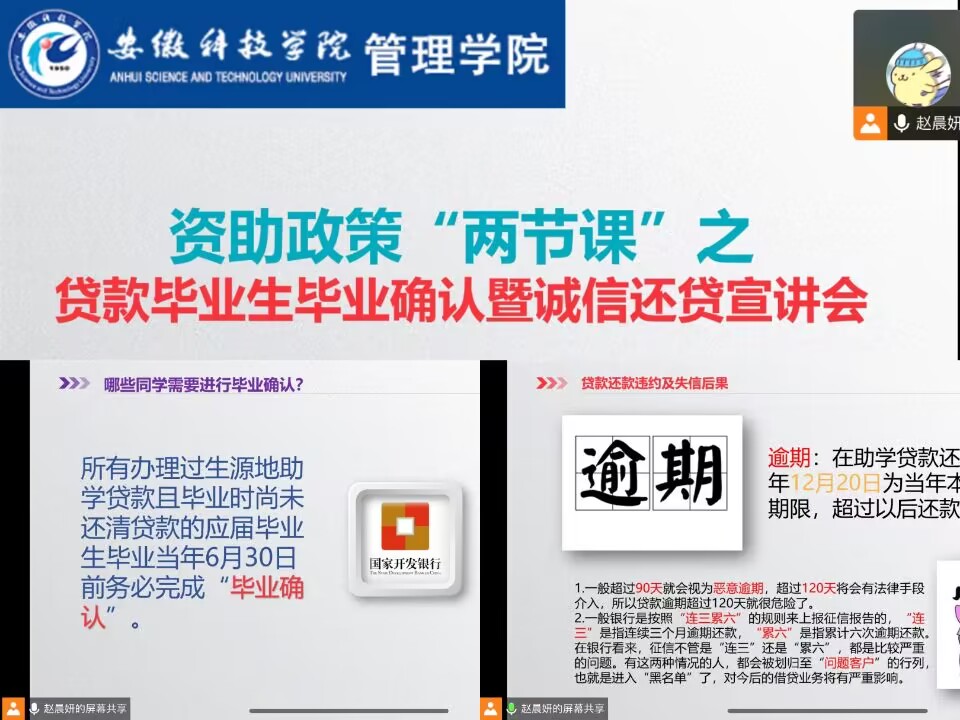 5月23日晚,管理学院通过腾讯会议线上召开毕业生诚信还贷宣讲会。会议由学院资助工作联系人赵晨妍主持,2023届贷款毕业生参加会议。会上,赵晨妍就生源地信用助学贷款还款政策、还款方式和流程、如何进行毕业确认、下一学段国家资助政策及归还本息的相关注意事项等内容,向大家详细讲解了还款须知并结合实际案例对贷款毕业生进行了诚信还贷教育和感恩教育,强调了贷款逾期的后果及个人征信知识,让同学们了解国家资助政策,树立诚信观念、建立良好的个人信誉,增强法律意识、责任意识和感恩意识,呼吁大家诚信还贷。