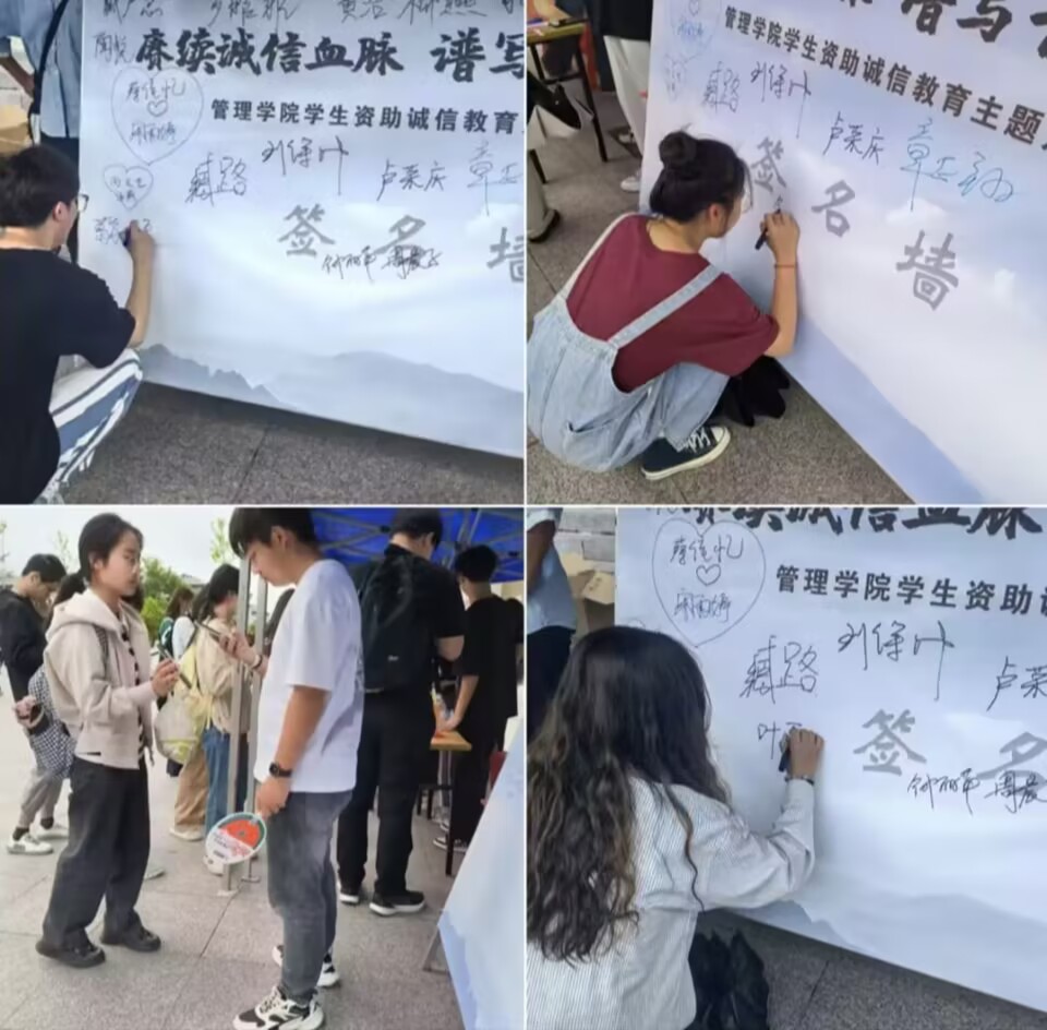 管理学院于5月25日在食堂前广场组织开展了以“赓续诚信血脉,谱写青春华章”为主题的资助诚信签名墙活动,引导学生诚信立身、承担责任、践行诚信、珍惜声誉。本次活动得到了同学们的积极响应,在诚信墙上留下自己的宣言,集体进行诚信宣誓。