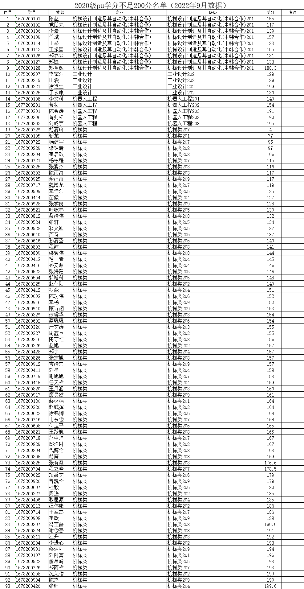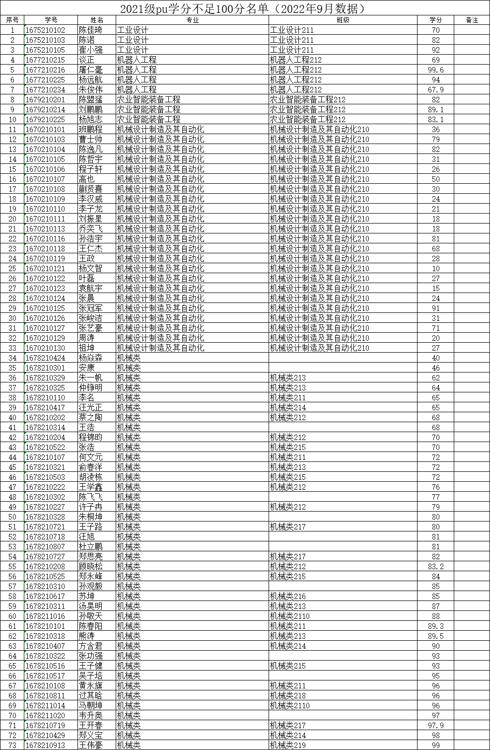 机械工程学院2022-2023-1学期二课堂学分(PU)未达标名单公示(2021级、2020级、2019级)
