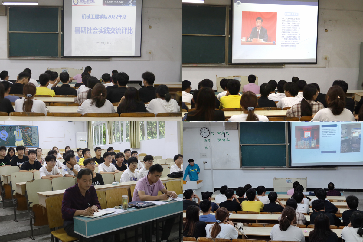 交流分享会议以PPT汇报和播放记录视频的方式进行,各班级团支部书记分别从暑假社会实践活动的工作布置、实施情况、特色活动等方面相继展开汇报;每个班级准备充分,社会实践内容充实,实践方式多样,特色鲜明,体现了机械工程学院学子风采。