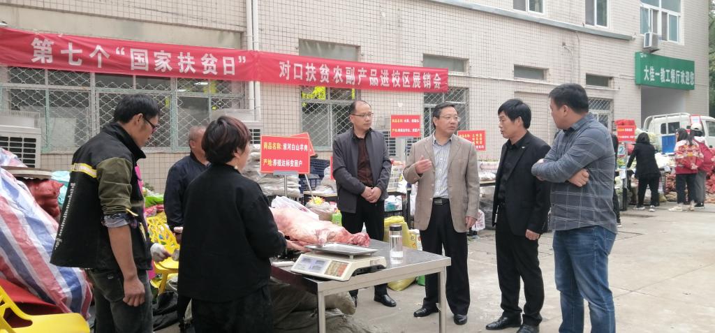 10月17日,是全国第七个扶贫日,今年10月还是第28个国际消除贫困月,为进一步巩固定点帮扶工作成果,接续推近脱贫攻坚与乡村振兴有效衔接,学校精心筹备的对口扶贫农副产品进校园展销会在凤阳校区第二食堂东侧如期举行。来自对口帮扶涡阳县的山羊肉、草鸡蛋、蔬菜、粉丝、杂粮等十几种特色农产品整齐摆放,集中展销,为广大教职工带来一场盛大的贫困地区优质农产品盛宴。