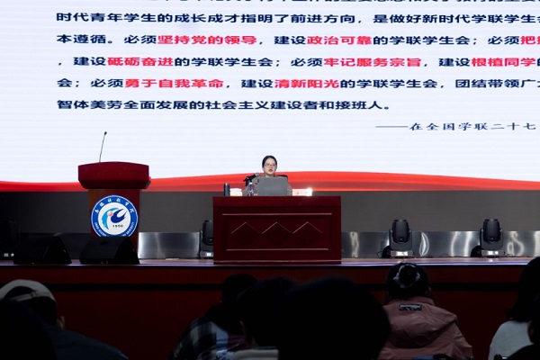 11月25日下午,安徽团省委学校部部长、省学联秘书处秘书长卢蓉应邀走进我校青马课堂,为全体青马学员传达解读中华全国学生联合会第二十七次代表大会精神。报告会由校团委书记黄立义主持。
