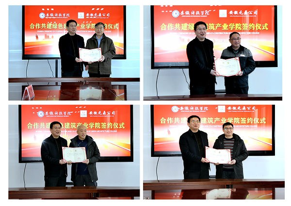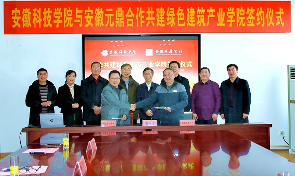 12月20日下午,我校“绿色建筑产业学院”签约暨揭牌仪式在安徽元鼎建设工程有限责任公司三楼会议室举行。党委副书记、校长李震,党委委员、副校长黄友锐,教务处处长俞浩,建筑学院院长张远兵、党委书记傅友福;安徽元鼎建设工程有限责任公司董事长叶士平、党委书记吕义龙、副总经理张志坚、总工程师张继文等共同参加了签约暨揭牌仪式。仪式由张远兵主持。