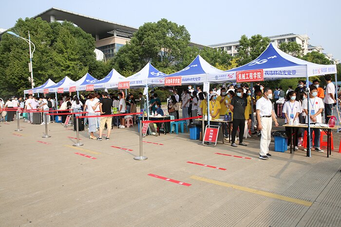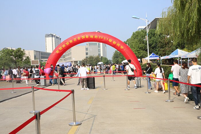 西区广场,2021级新生在迎新工作人员的引导下安全有序入校报到。校领导现场听取关于入校流程、入校消毒工作、疫情防控物资准备情况的汇报,并就相关工作优化做出现场指导。