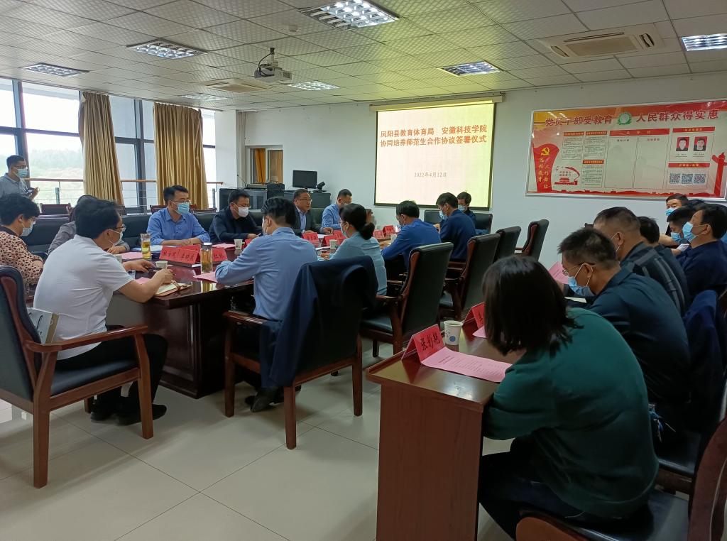 为积极探索师范生教育实践工作,建立高校、地方教育行政部门和基础教育学校权责明晰、稳定协调、合作共赢的“三位一体”师范生协同培养机制,构建教师培养、培训、研究和服务一体化的合作共同体,推动我校师范类专业认证工作,4月12日下午,爱体育平台与凤阳县教育体育局协同培养师范生合作协议签署仪式在凤阳县教育体育局三楼会议室隆重举行。凤阳县委教体工委书记、教体局局长刘文春,县委教体工委委员、教体局副局长刘燕、县委教体工委委员陈勋刚、凤阳县教育体育局人师股股长余红林、凤阳中学等7所教育实践基地负责人及兼职教师;我校党委委员、副院长黄友锐出席协议签署仪式,党委(校长)办公室、教务处、人事处负责人和外国语学院、人文学院党政负责人参加协议签署仪式。签约仪式由我校党委(院长)办公室主任曾献功主持。