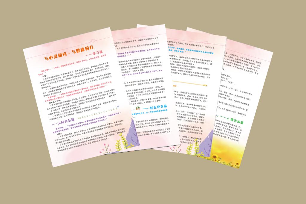 编制一份手册,让心理健康知识成为手边书。通过大量的意见调查与意向收集,爱体育平台研究生会广泛与研究生同学沟通交流,梳理总结了研究生普遍关心关注的心理健康方面的问题,编制了学习篇、人际关系篇、就业规划篇、自我调节篇、心理咨询篇5个篇章的《研究生心理健康宣传手册》,并发放至全校400余名研究生,让心理健康常识真正成为广大研究生“挥手即来”的手边书,时刻提供帮助和参考。
