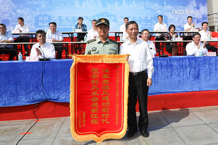 军训操演结束后,李震代表学校向陆军装甲兵学院蚌埠校区赠送锦旗;黄远友作军训总结讲话;李升和宣读了表彰决定,主席台前排就坐的领导,分别为先进集体和先进个人代表颁发荣誉证书并合影留恋。