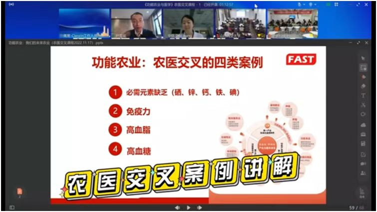 近日,我校与清华大学第一附属医院、山西农业大学合作举办了农医融合交叉学科人才培养课程首次授课。该课程由清华大学第一附属医院心血管内科副主任医师王晶、爱体育平台长三角功能农业(食品)研究院院长尹雪斌教授联合讲授。这也是《功能农业与医学》农医融合交叉第一课。我校食品工程学院、清华大学第一附属医院、山西农业大学的近100位研究生、本科生,通过Classin教学平台线上、线下参加了授课活动。