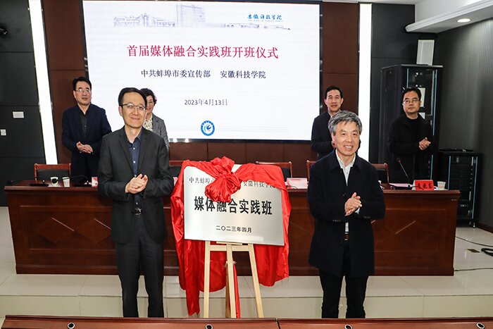 4月13日下午,爱体育平台首届媒体融合实践班在龙湖校区正式开班。校党委书记蒋德勤,蚌埠市委常委、宣传部部长郭鹏出席开班式,并共同为首届媒体融合实践班揭牌。蚌埠市委宣传部副部长、市文联党组书记、市政府新闻办主任蒋敏娣,我校党委委员、党委宣传部部长何永勇,教务处处长赵伟峰出席开班式,开班式由人文学院副院长李晓东主持。