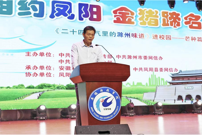 为进一步弘扬中华优秀传统文化,彰显地域传统美食特色,6月6日芒种节气当天,《二十四节气里的滁州味道》进校园芒种篇活动在我校大学生活动中心成功举办。我校党委委员、宣传部部长何永勇,滁州市委网信办副主任朱智青,凤阳县委常委、宣传部部长赵文霞以及校团委、食品工程学院有关负责同志出席活动。食品工程学院近两百名学生参加活动。