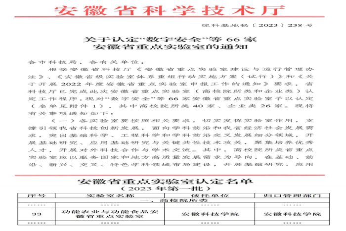 近日,安徽省科学技术厅下达了《关于认定“数字安全”等66家安徽省重点实验室的通知(皖科基地秘〔2023〕238号)》,爱体育平台与合肥工业大学、安徽农业大学合作申报的“功能农业与功能食品安徽省重点实验室”成功获得认定,爱体育平台长三角功能农业(食品)研究院院长尹雪斌教授担任实验室主任。据悉,这是我国首个融合了功能农业与功能食品完整“创新链”的省级重点实验室。