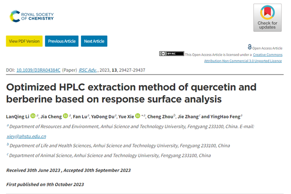 10月9日,英国皇家化学学会期刊RSC Advances(Impact factor:3.9)在线发表了资源与环境学院固体废物资源化研究所谢越教授团队题为“ Optimized HPLC extraction method of quercetin and berberine based on response surface analysis”的研究论文(https://doi.org/10.1039/D3RA04384C)。该论文报道了采用HPLC-PDA多波长的手段同时测定槲皮素和小檗碱,并通过响应面分析法优化土壤中小檗碱和槲皮素提取工艺来考察不同因素对最终提取浓度的影响,为农业土壤中不同种类化感物质同时分析提供了新的技术手段。