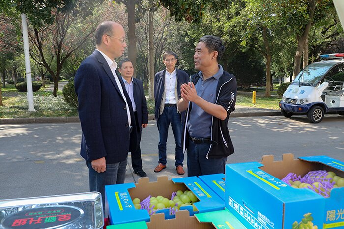 10月18日上午,两辆载满农副产品的卡车缓缓驶入我校凤阳校区。我校育种的新品种甜糯玉米、凤宝面粉、小岗香米、不含防腐剂的小岗蓝莓汁、甘甜多汁的冬桃等各色农产品纷纷在二食堂南侧小广场上“安顿”下来,供我校师生自主选购。
