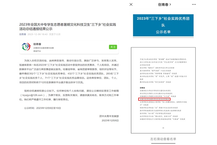 12月6日,共青团中央发布2023年全国大中专学生志愿者暑期文化科技卫生“三下乡”社会实践活动总结通报结果,我校建筑学院“拾遗”发展成就观察团脱颖而出,荣获全国“2023年‘三下乡’社会实践优秀团队”称号。