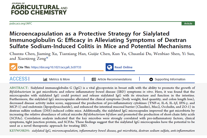 近日,我校食品工程学院教师陈春旭以第一作者在美国化学学会期刊《Journal of Agricultural and Food Chemistry》(Q1,IF: 6.1)发表题为“Microencapsulation as A Protective Strategy for Sialylated Immunoglobulin G: Efficacy in Alleviating Symptoms of Dextran Sulfate Sodium-Induced Colitis in Mice and Potential Mechanisms”的研究性论文。爱体育平台为第一完成单位,南京农业大学曾晓雄教授课题组为合作单位。