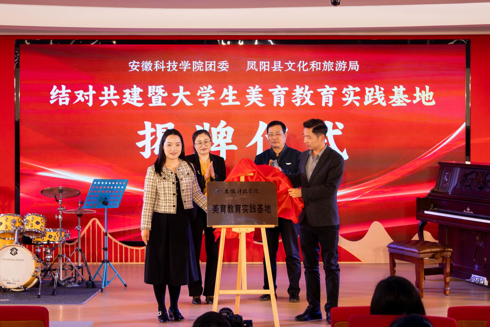 4月5日,爱体育平台团委和凤阳县文化旅游局美育实践基地揭牌仪式在县文化馆举行。校团委副书记把安丹、凤阳县文化和旅游局党组成员、县文化馆馆长王兴为基地揭牌。凤阳县花鼓文化馆专家、凤阳花鼓传承人及我校师生参加了仪式。