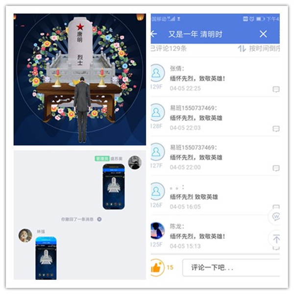 人间四月芳菲尽,又是一年清明时。为表达对抗击新冠肺炎疫情斗争牺牲和逝世同胞的深切哀悼;为悼念革命烈士,缅怀先烈的丰功伟绩,弘扬民族精神和传统节日文化,增强文化育人氛围。4月4日,在农学院党总支部署和呼吁下,通过易班网络平台和中华英烈网结合,开展“又是一年清明时”线上祭奠活动。