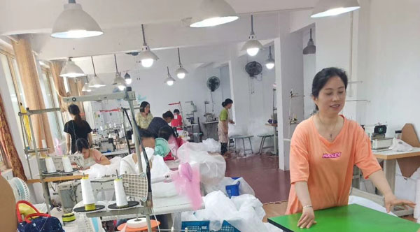 在与厂内相关负责人沟通后,陈晨参观并体验了新安镇红运制衣厂的工作流程。厂内负责人说道:“我们之前都是接单做羽绒服的,而今年受疫情影响暂时接不到原订单,只能退而求其次,做一些工价极低的一次性隔离衣。虽然隔离衣的订单数量较多,但是极不划算,无论是公司老板还是员工的工资都比以往低了许多。”