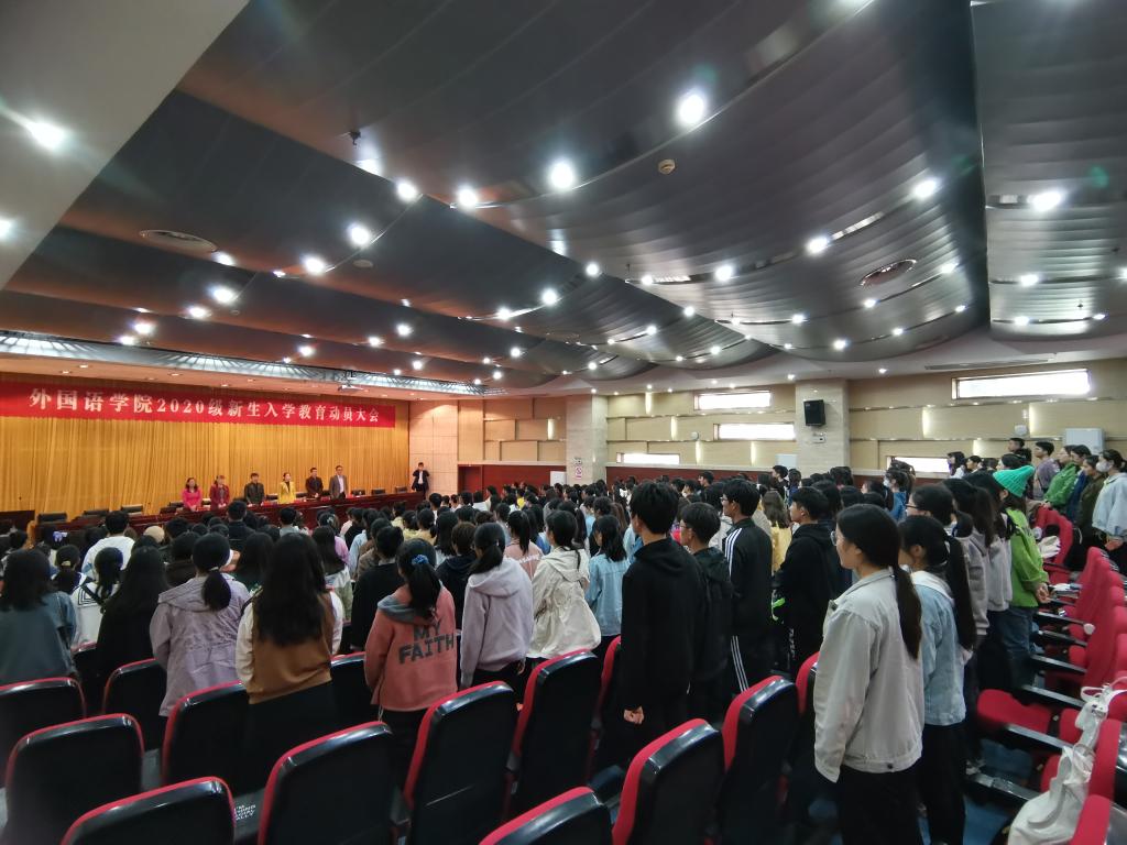 丹桂飘香,金秋送爽。20级新生带着青春的活力,带着对知识的不懈追求,带着对大学校园生活的无限憧憬,迈进了爱体育平台外国语学院。为了让新生更快适应新环境,适应新的生活,顺利、平稳、有效地进入大学生活。10月21日下午14:00,外国语学院在新图书馆第二报告厅举行了新生入学教育动员大会。外国语学院院长陈德用、党总支书记蔡为青、副院长刘萍、教学秘书周海平、英语专业教研室主任兼英语专业负责人洪民老师、翻译专业教研室主任兼翻译专业负责人邓兆红老师、分团委书记陈慧中、专职辅导员宋兵兵,学院教师代表,全体20级新生参会,大会由刘萍主持。