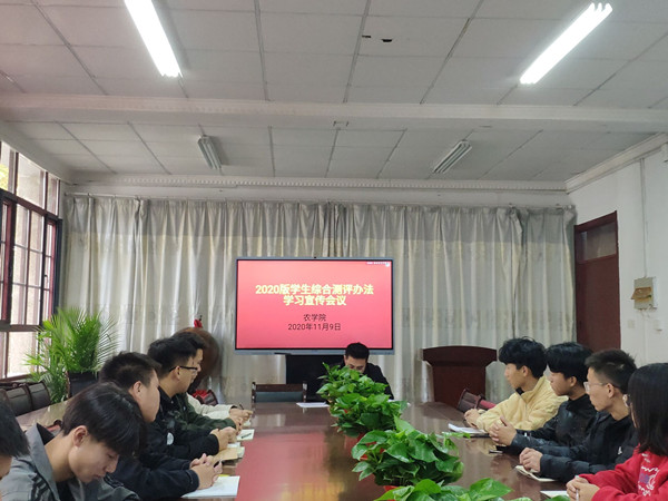 为引导学生德智体美劳全面发展,强化学生综合素质测评的导向和激励作用,11月9日,农学院在会议室召开2020版学生综合素质测评办法学习会议,全面解读《爱体育平台学生综合素质测评办法》(2020版)。参加此次会议的主要有2018级、2019级和2020级的各班班长,会议由辅导员汪道兵主持。