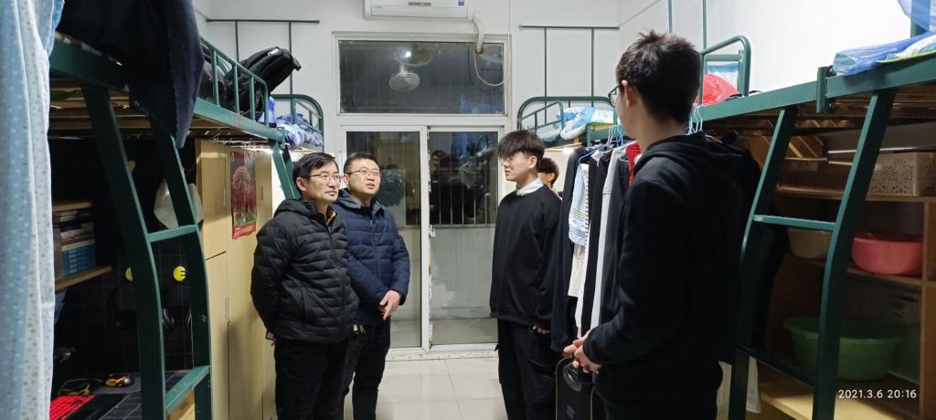 陈德用在男生寝室仔细询问了学生到校情况,寒假见闻以及新学期的规划等,叮嘱男生们要多锻炼,拥有一个强健的体魄才是革命的本钱,并建议大一至大三的同学们都要有明确的分工。张海亮也详细了解学生的思想动态,对宿舍安全卫生方面给予指导,核查学生到勤情况,摸排是否有外宿学生。在与宿舍学生沟通中,他提醒学生注意宿舍安全,做到人走电断、门关、锁落,安全不留死角,同学间相互监督,强调宿舍安全报告的重要性,要求各班班长、安全委员、宿舍长严格执行落实。