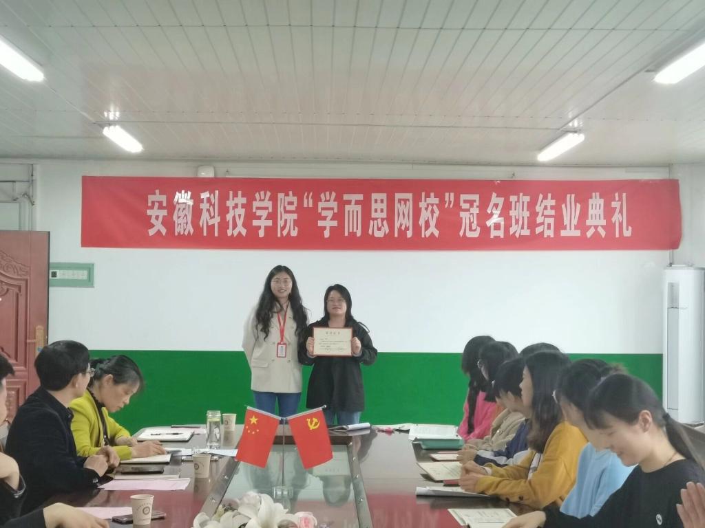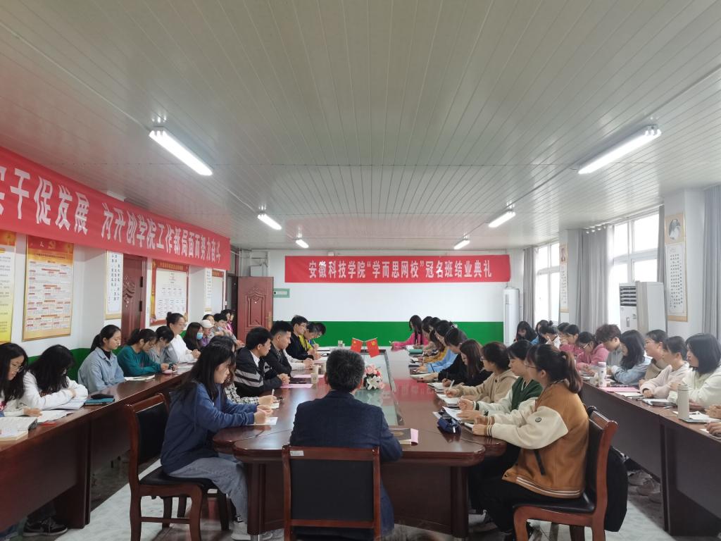 4月25日下午,外国语学院在学院会议室举行“学而思网校”冠名班结业典礼。学而思网校皖北区域负责人李晨瑜、招聘负责人凌达、冠名班企业方班主任蔺一峰、外国语学院院长陈德用、党委书记蔡为青、副书记张海亮、团委副书记宋兵兵等校企双方领导出席典礼,冠名班全体学员参加活动。典礼由张海亮主持。
