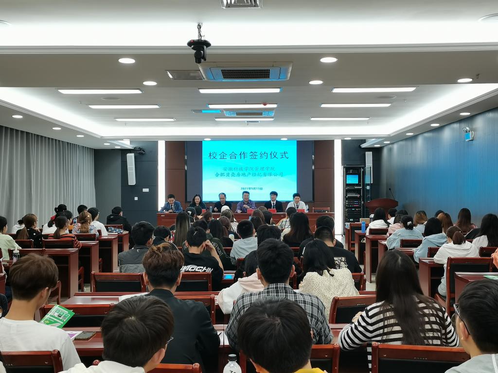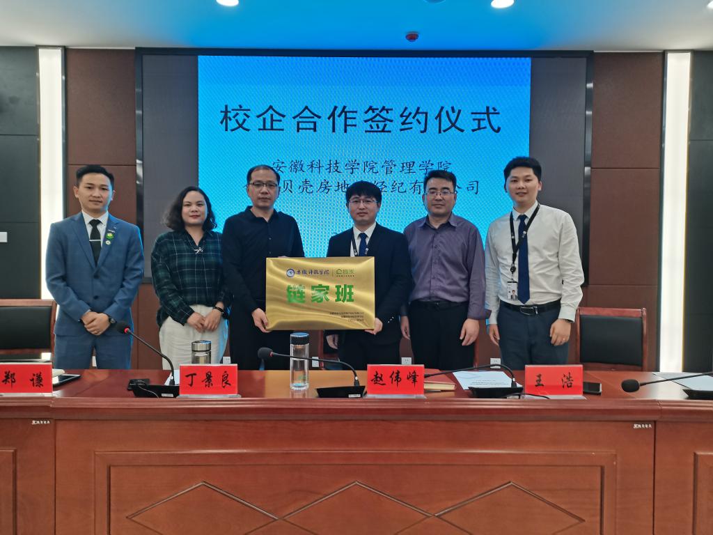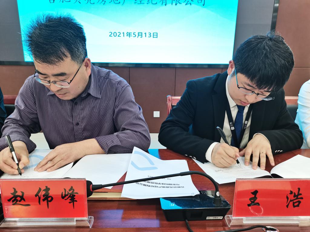 赵伟峰与王浩共同签署了《爱体育平台与合肥贝壳房地产经纪有限公司校企合作协议书》,举行了人才培养合作班授牌仪式。
