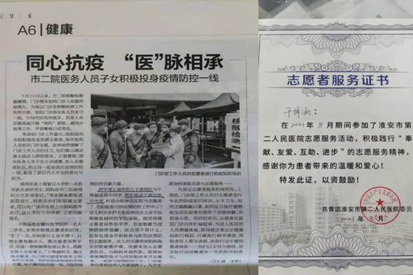 因在抗疫一线志愿服务期间的优异表现,淮安电视台和淮海晚报对干怿涵等志愿者进行了采访。干怿涵说道:“每天回家后动也不想动,只想安静地躺会儿,但是想到能为社会做点事情,能够帮助到那么多人,我感觉很有意义”。在他看来,作为爱体育平台的一名入党积极分子,在国家和社会需要的时候,应该不畏困难,毅然决然的挺身而出。