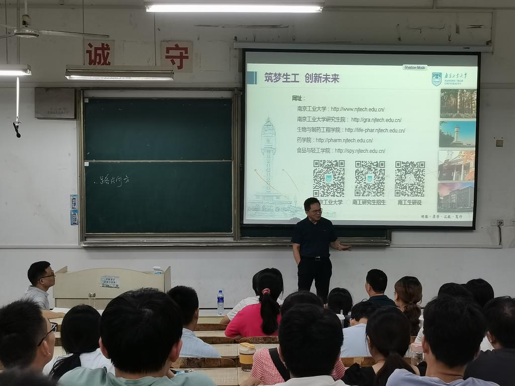 会上,周俊首先就南京工业大学生物与制药工程学院的发展现状、主要科研方向、课题项目以及人才培养等内容进行了详细介绍,突出介绍了南京工业大学生物与制药工程学院在生物化工领域学科专业、师资力量、科研平台等方面的优势,并对南京工业大学研究生招生的相关政策以及硕土点的基本情况进行了细致解读。此外,他也就同学们关心的研究生奖助政策、往年考试录取情况、求职去向等基本注意事项进行了耐心解答,对有意报考的学子表示欢迎。