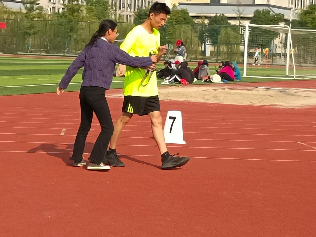 在缓冲区、跑道旁、检录处......都能看到学风建设部负责人马敬茹的身影。她带领运动员检录、帮助运动员赛前热身、搀扶刚刚结束比赛的运动员离开赛场等,她一丝不苟地完成分配的工作,确保运动员顺利完成比赛。在运动员的眼里,马敬茹就是他们坚实的后盾,让他们能够心无旁骛,全力以赴。