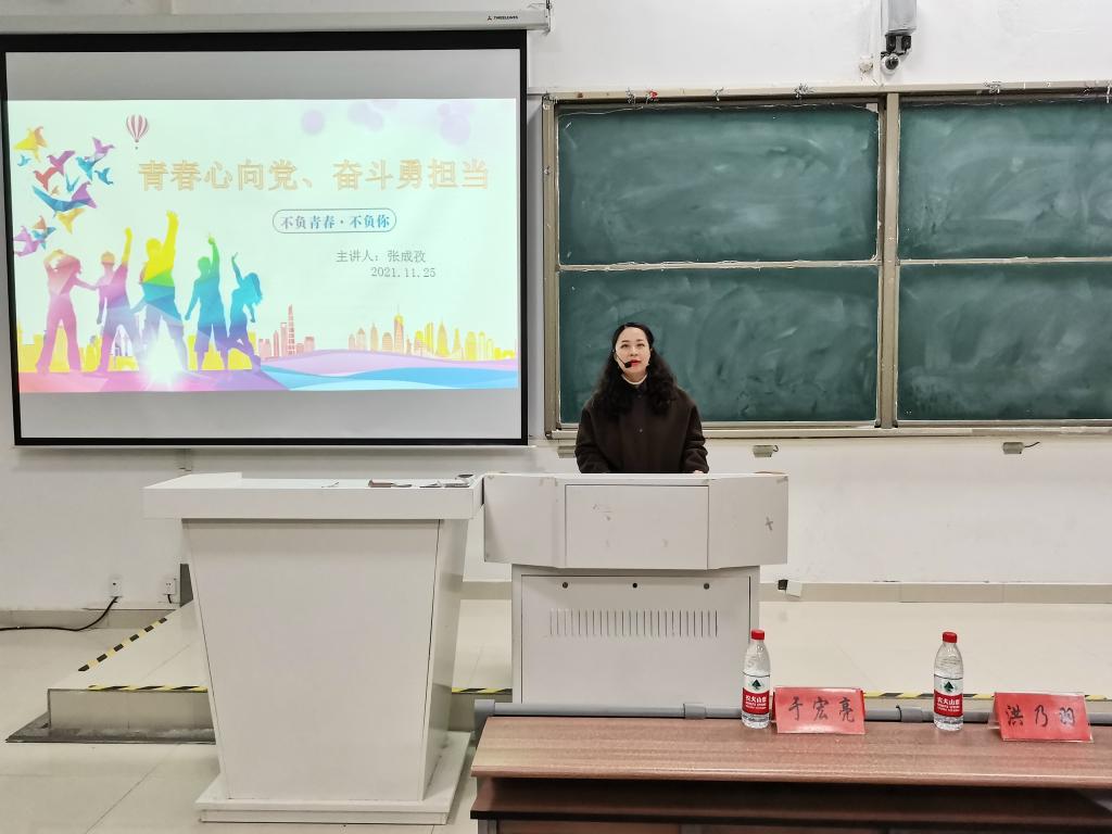会上,学院团委书记张成孜首先向大家介绍了共青团的使命。她指出,青年象征着青春与希望,同时也肩负着责任与担当,青年团员要奋勇当先,充分发挥先锋模范作用。