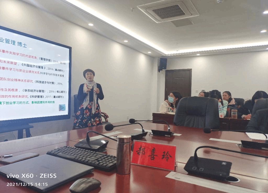 2021年12月15日下午,应财经学院邀请,安徽财经大学郝喜玲博士在西辅楼317作了题为“如何做好学术研究——论文写作和课题申报经验与教训”的学术讲座。讲座由财经学院院长郝世绵主持,财经学院全体青年教师聆听了讲座。