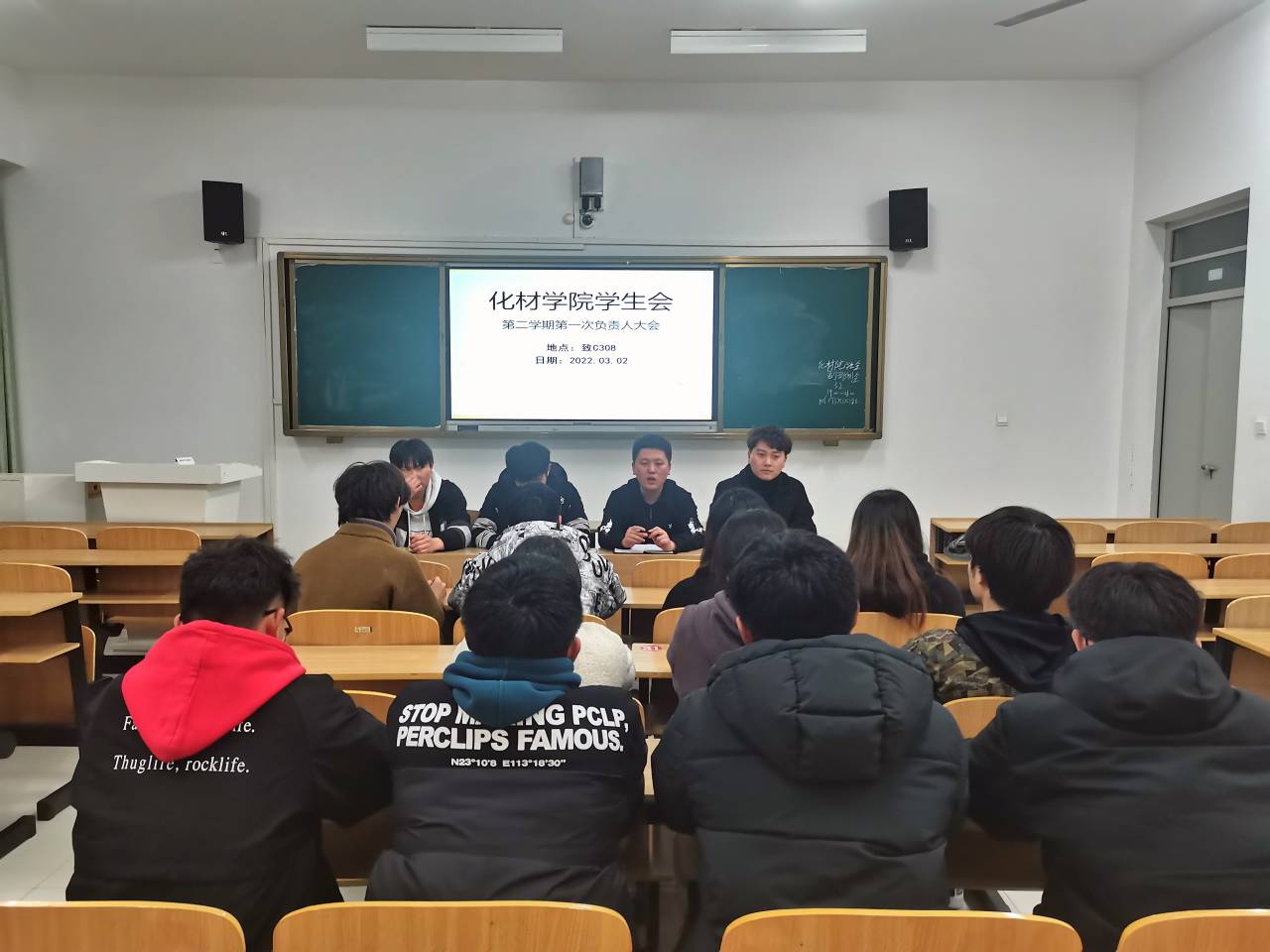 3月6日,化学与材料工程学院在致知楼C308教室召开学生会新学期工作会议。会议由辅导员沈竞成主持,院学生会主席团成员以及各部门负责人与会。