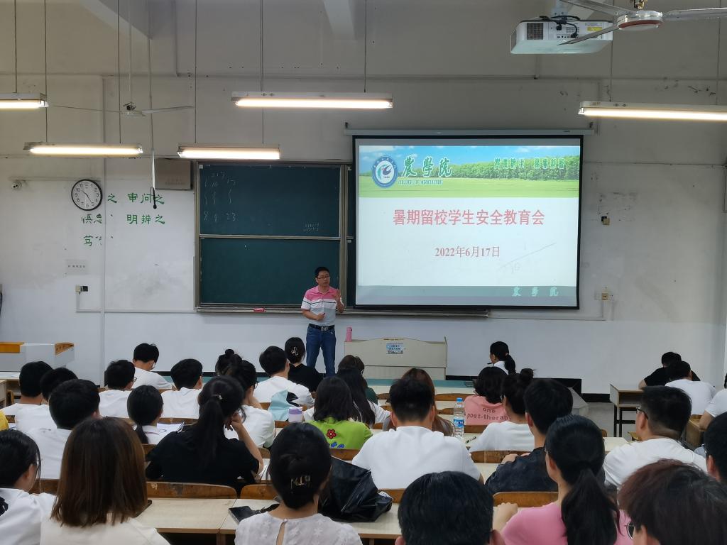 为加强暑期留校学生安全教育管理,6月17日上午,农学院在求知楼A101教室召开2022年暑期留校学生安全教育会。农学院党委副书记、纪委书记张轶辉,农学院纪委副书记、团委书记郑玉莲,农学院辅导员汪道兵、杨孝延及全体留校学生参加会议。