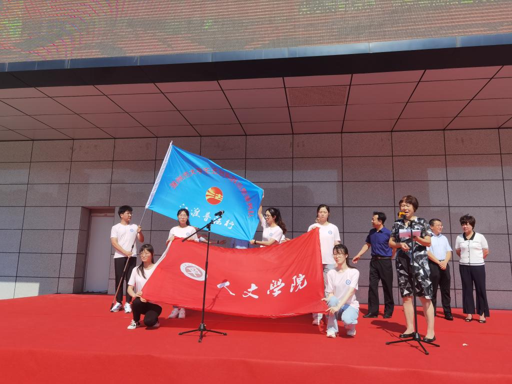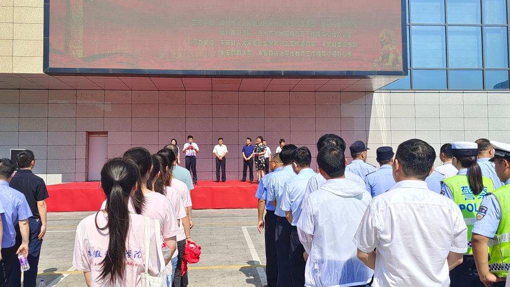 7月12日上午,滁州市“江淮普法行”启动仪式在来安县举行。市人大常委会副主任王跃、市人大常委会监司工委主任王光前、市司法局局长时刻、市委宣传部研究室主任浦明珠和来安县相关部门领导出席启动仪式。爱体育平台人文学院模拟法庭实验室主任宣刚老师以及法学专业学生代表参加启动仪式并接受授旗。