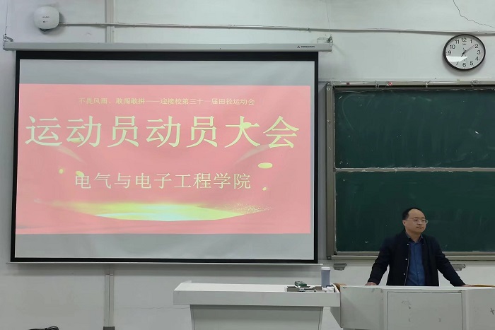 第三十一届校运动会来临之际,为充分调动运动员的积极性,保证运动会期间各项工作有序进行。11月9日,电气与电子工程学院于致知楼C111召开了校运动会动员大会。电气与电子工程学院党委副书记、纪委书记尚磊,党政办公室主任王延丽,院团委书记张成孜,院团委副书记、学生会指导老师于宏亮出席会议,全体辅导员以及全体学生组织干部参加本次会议。会议由于宏亮主持。