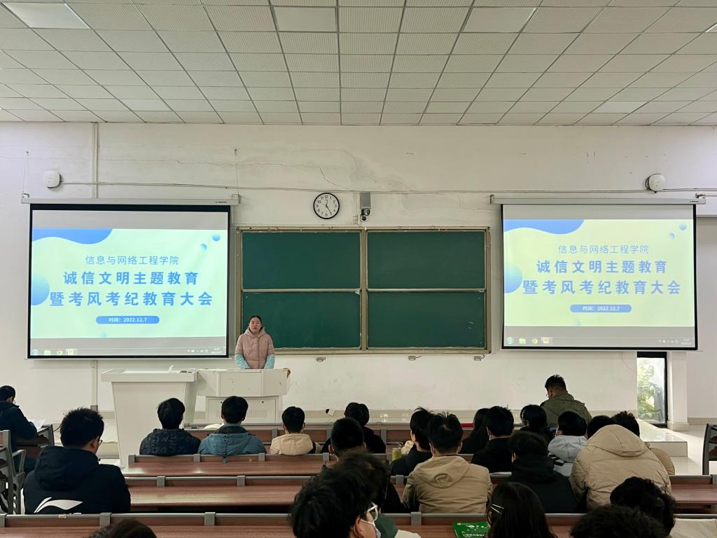 为进一步提高学生诚信文明素养,加强考风考纪教育。12月7日中午,信息与网络工程学院于致知楼C111召开诚信文明主题教育暨考风考纪教育大会。信息与网络工程学院党委副书记、纪委书记韦乃学,专职辅导员陈凯、李军成、崔北坤出席本次大会,22级各班班委及学生会干部参加本次大会,大会由陈凯主持。