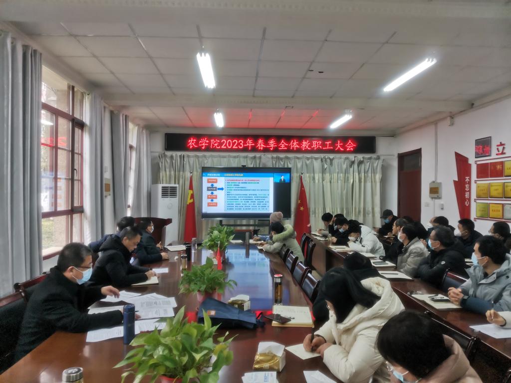 2月23日下午,农学院在学院会议室召开2023年春季全体教职工大会,回顾总结寒假工作情况,部署学期初和2023年重点工作。全体教职工参加会议,农学院党委副书记、院长崔广荣主持会议。