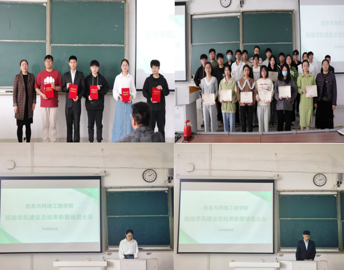 会上,参会老师对获得“学风建设先进个人”、“学风建设先进班级”获奖代表进行了颁奖。崔北坤宣读了《信息与网络工程学院党委关于表彰2022年班级学风建设“先进班级”、“先进个人”的决定》。丁阿敏宣读了《信息与网络工程学院2023年班级学风建设实施方案》,对方案中班级课堂学风、宿舍学风、考场的考风等方面的要求和评选指标做了说明。学风建设先进班级代表宫宗怡、盛猛;学习型宿舍先进个人代表章国豪、晁婉宁、崔可等人依次上台发言,分享了在班级的管理、个人学习经验和班级宿舍学风建设的经验做法。