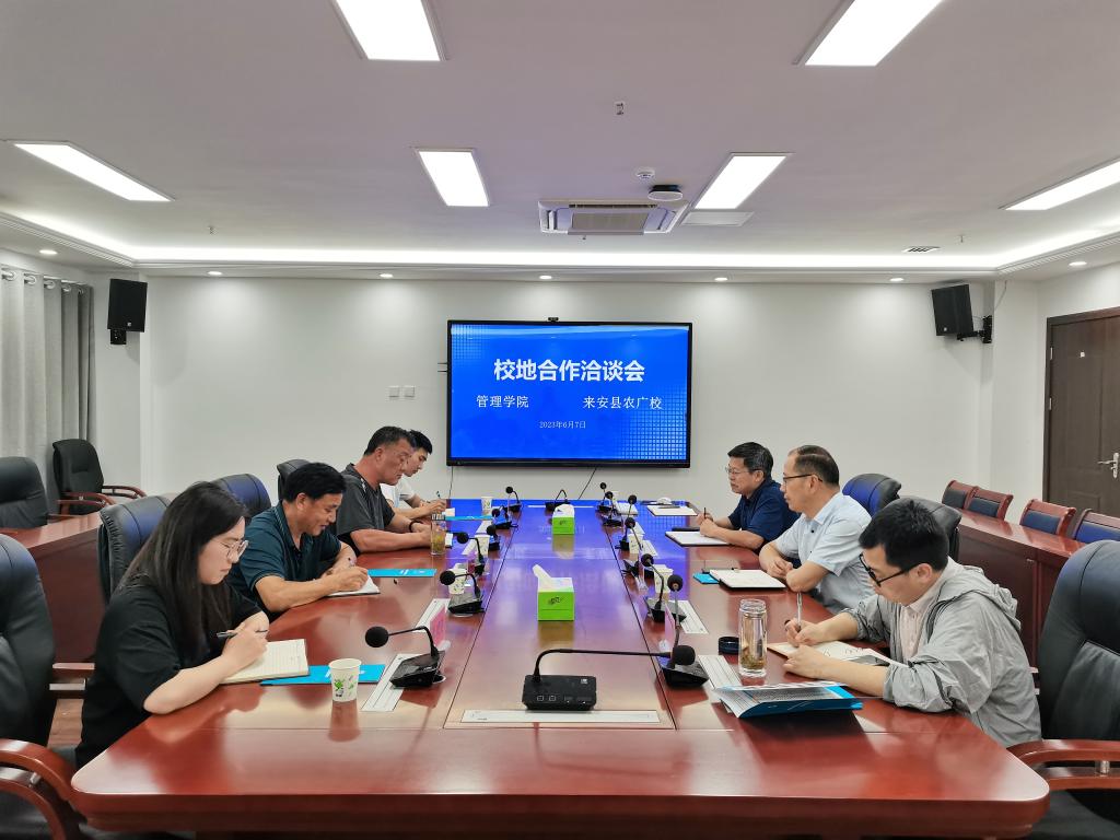 为深入开展学习贯彻习近平新时代中国特色社会主义思想主题教育,服务地方经济社会发展,助力乡村振兴,6月7日下午,来安县农业科技教育中心主任黄德武一行应管理学院邀请,来校洽谈校地合作事宜,管理学院党政领导出席了座谈会,座谈会由管理学院党委书记丁景良主持。